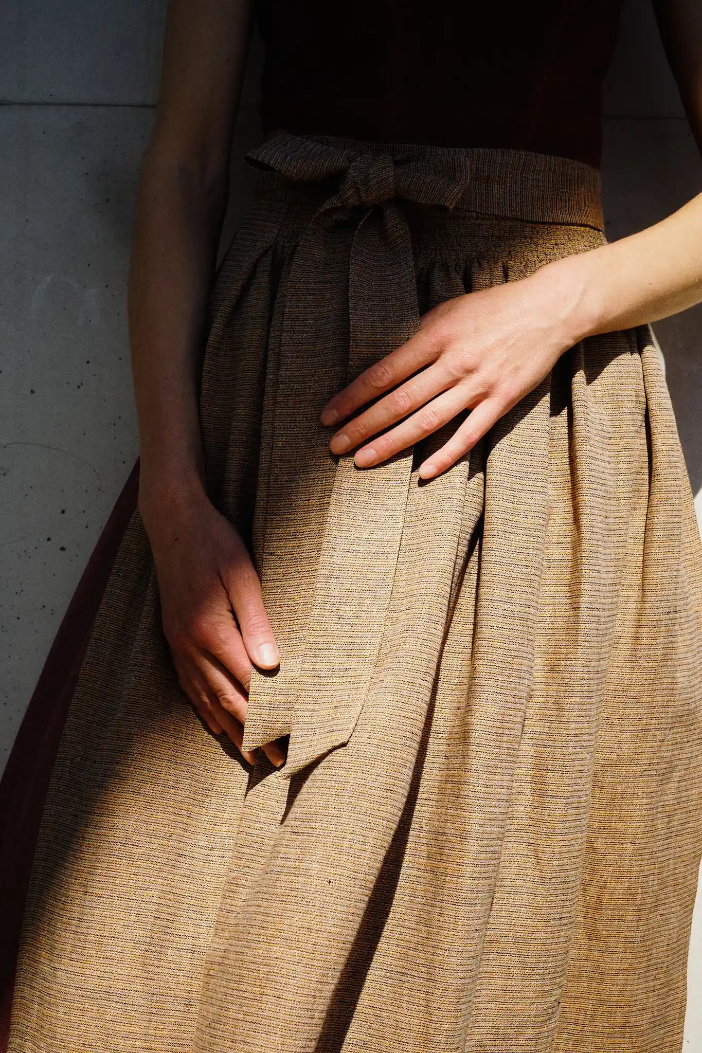 Der warme Ockerton wird von eingewebten Streifen in unterschiedlichen Blautönen durchzogen und verleiht dem Modell Tiefe und Struktur.