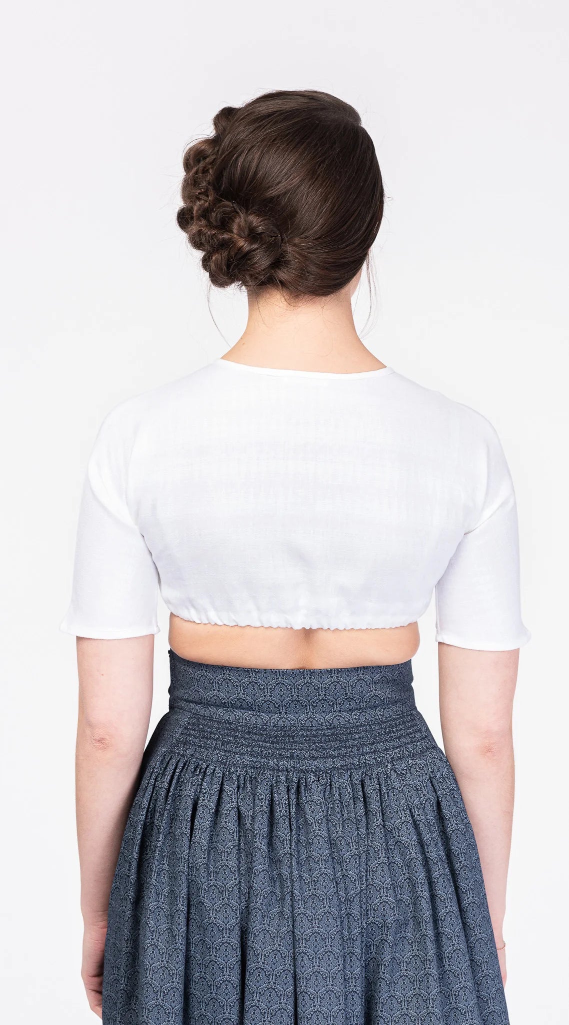 Dirndlbluse ROMY ist klar geschnitten und pur im Design. In unserem Atelier in München von Hand gefertigt, komplettiert sie Mieder und Dirndl mit klarer Linie.